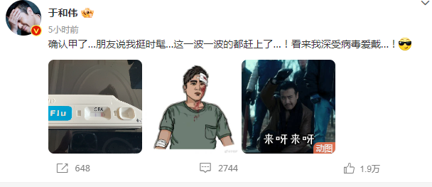 他在微博調侃:確認甲了,朋友說我挺時髦,這一波一波的都趕上了……看來我深受病毒愛戴!