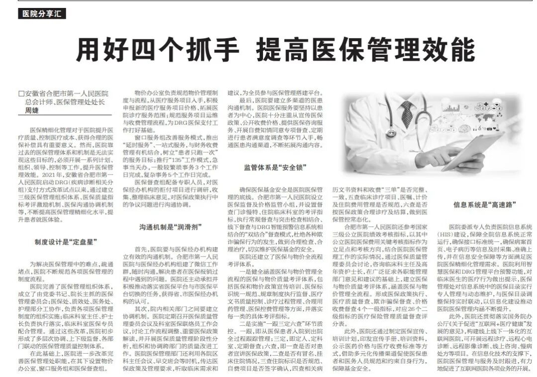 醫保精細化管理對於醫院提升醫療質量、控制醫療成本、獲得合理的醫保補償具有重要意義。然而,醫院靠過去的醫保管理體系和機制是無法實現這些目標的,必須開展一系列計劃、組織、領導、控制等工作,提升醫保管理效能。2021年,安徽省合肥市第一人民醫院啟動DRG(疾病診斷相關分組)支付方式改革試點以來,通過建立三級醫保管理組織體系、醫保質量指標考評激勵機制、醫保溝通協調機制等,不斷提高醫保管理精細化水平,提升患者就醫體驗。