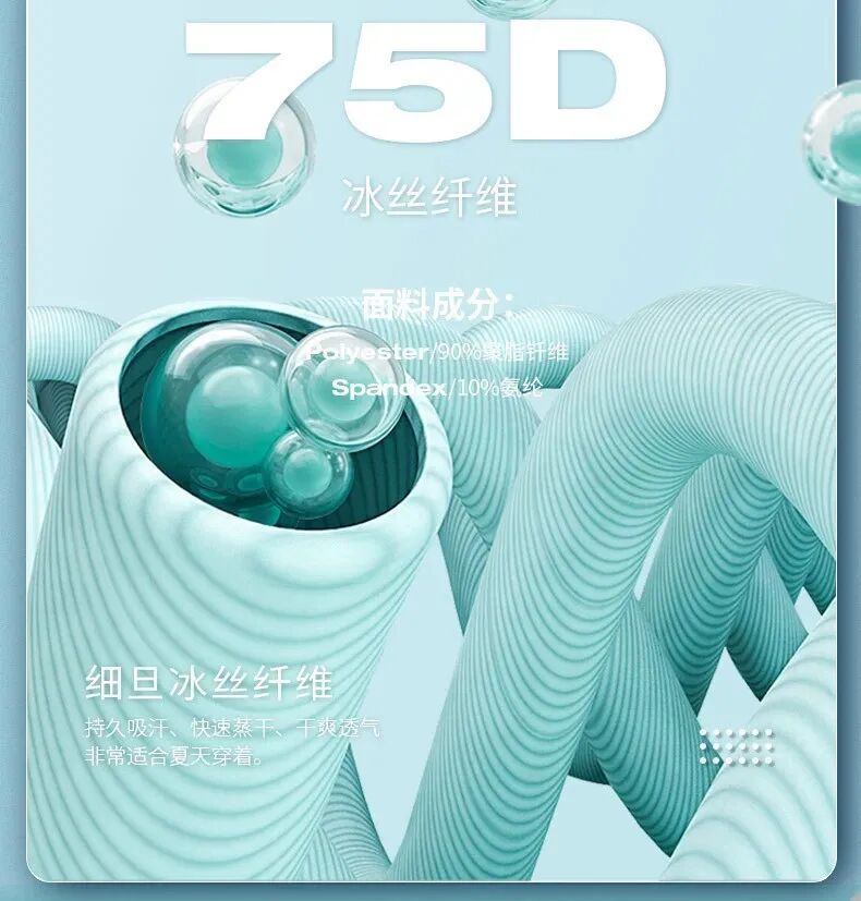 4、冰絲纖維:使用75D高支高密的冰絲纖維,保持空氣瞬間流通,速幹吸溼,同時具有更好的回彈力,抗皺更好更柔軟。