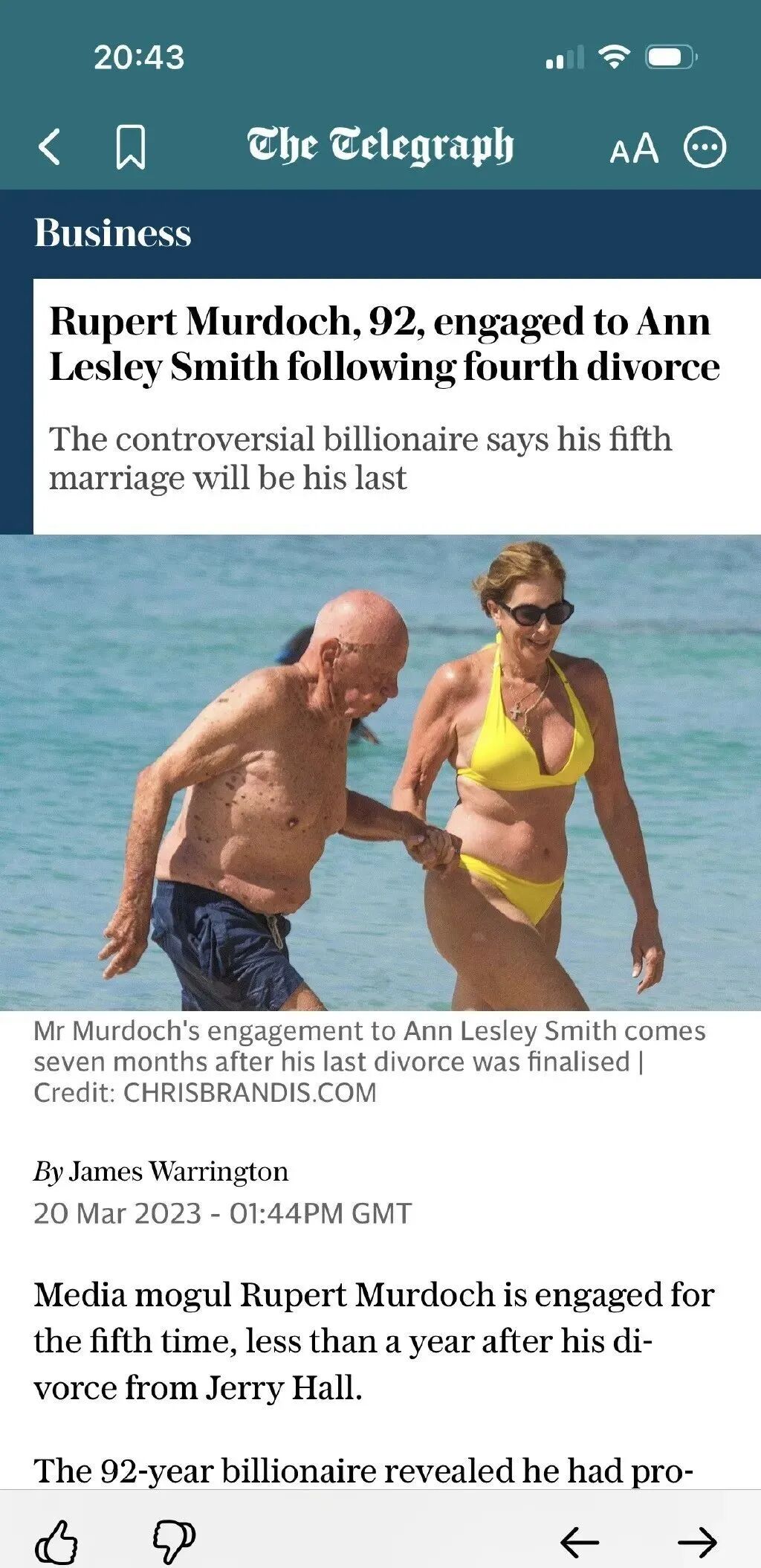 然而,如此令默多克上頭的感情也沒能成為他的最終歸宿,兩人的婚姻在2022年戛然而止。