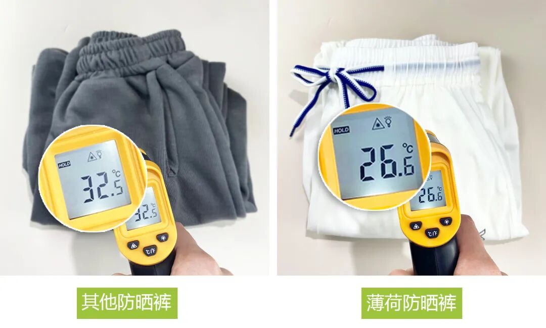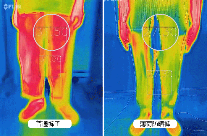 普通褲子穿了半小時高溫紅久久不散,而防曬褲清清爽爽,最終穩定在27℃