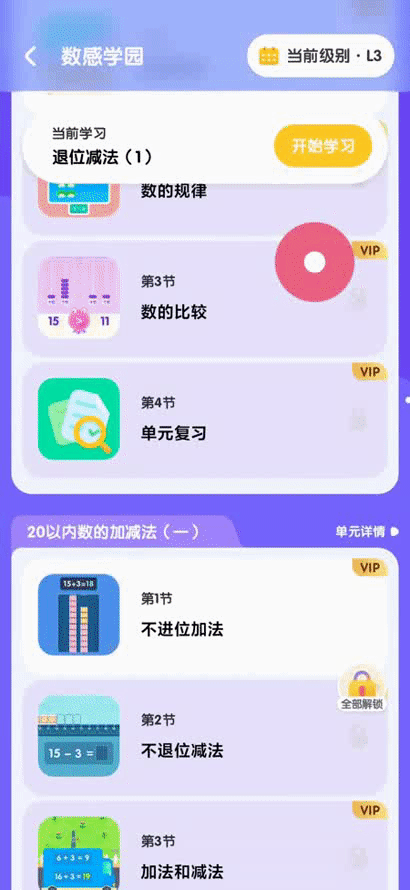 數感學園是數感星球的核心板塊,從L1~L8共分為8個級別,整合了學前~四年級每個學段的核心知識點,包括數的認識、四則運算、比大小、分數、小數、圖形、面積等各類運算