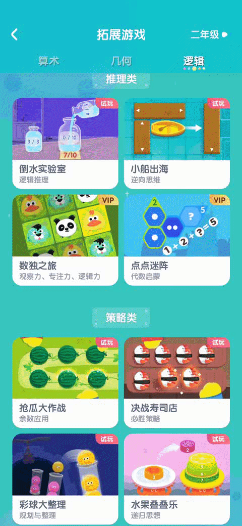 孩子最愛的就是拓展遊戲,裡面包含算術、幾何、邏輯 三種遊戲模式,1300+數學遊戲練習。