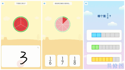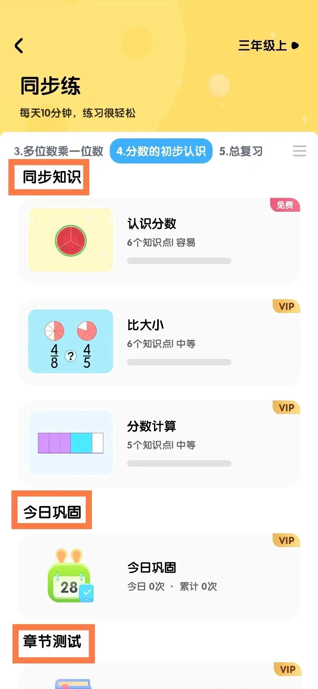 每一章的知識點也拆分得非常細,比如上圖中,三年級上的【分數初步認識】就把分數知識點拆分成〔認識分數〕、〔比大小〕、〔分數計算〕三個模塊。