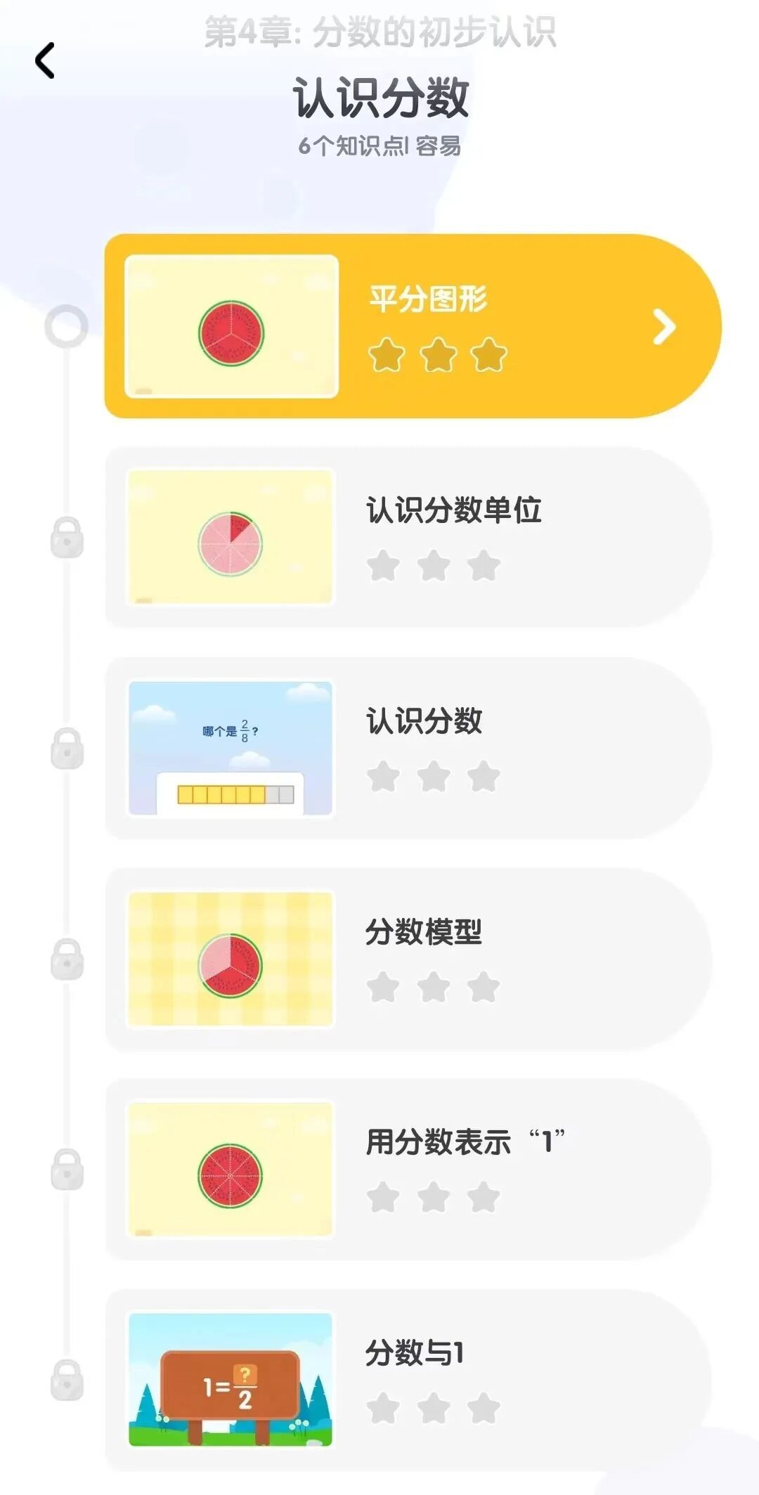 每個模塊又再次細分。比如,〔認識分數〕就分為下圖這6個小知識點。