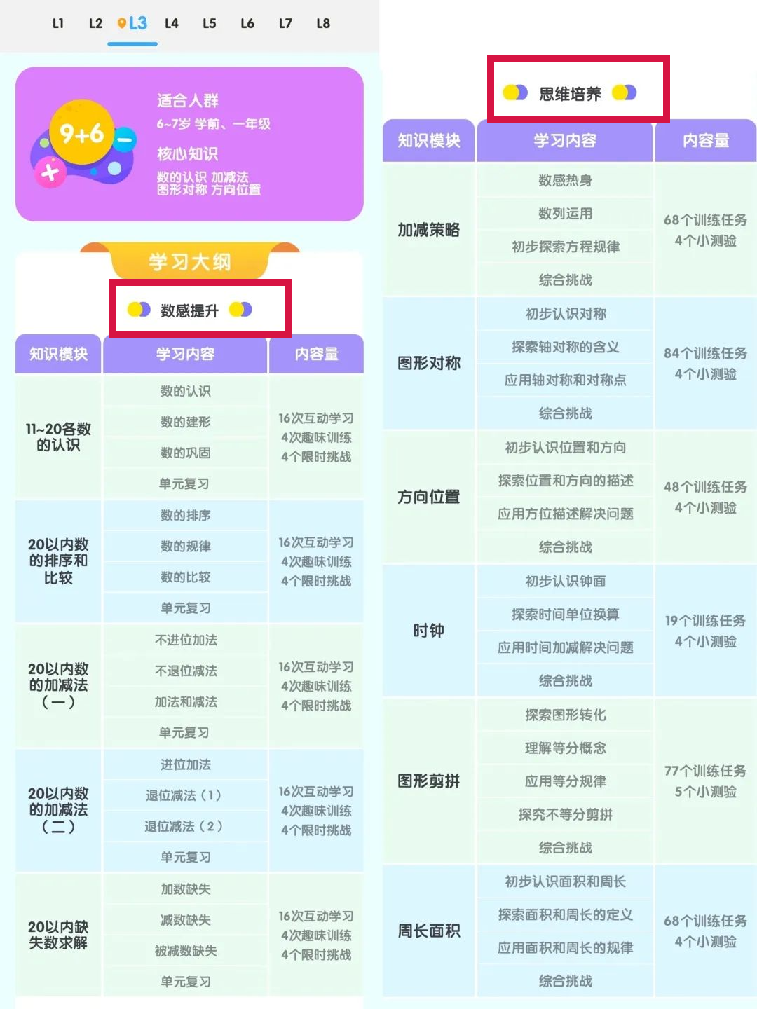 每個級別都會從【數感提升】和【思維培養】兩方面幫助孩子系統學習。