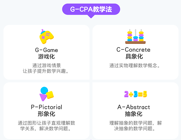 並且,數感星球還在新加坡數學CPA教學法的基礎上,融入了美國流行的遊戲化學習(game-basedlearning),兩者結合,就發展出G-CPA教學法。