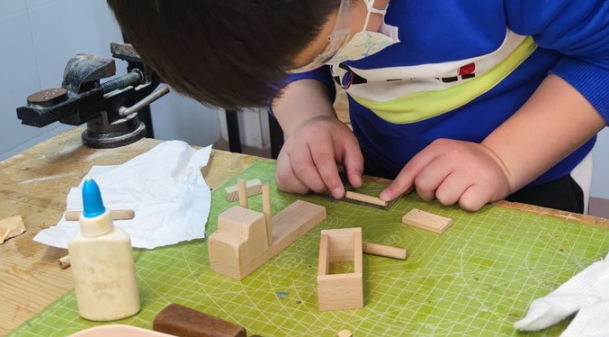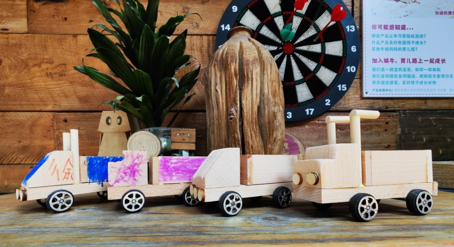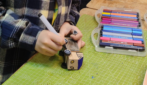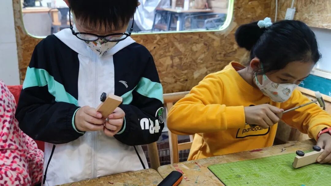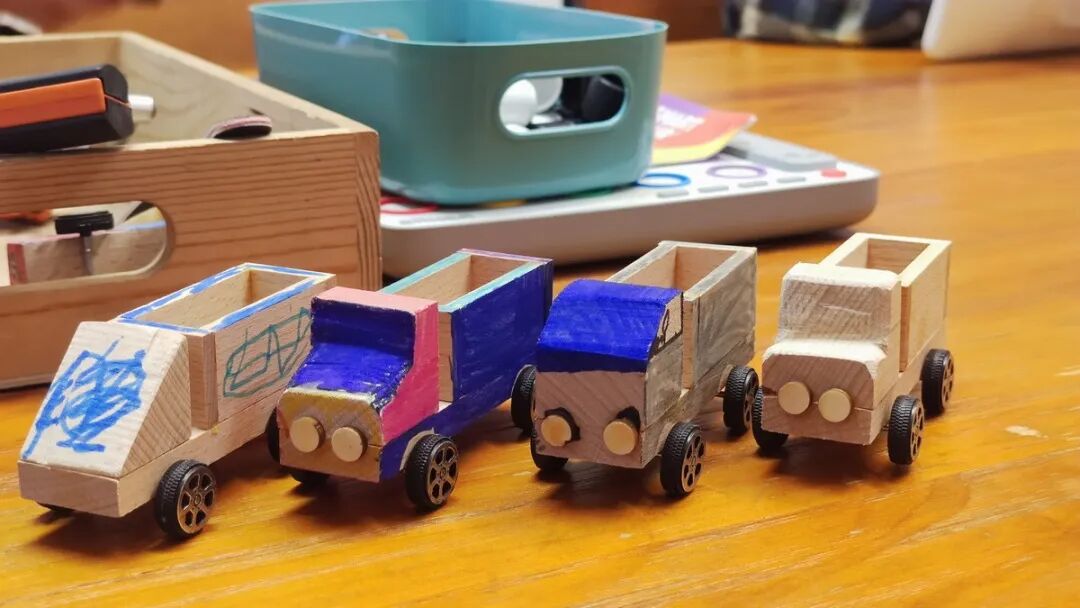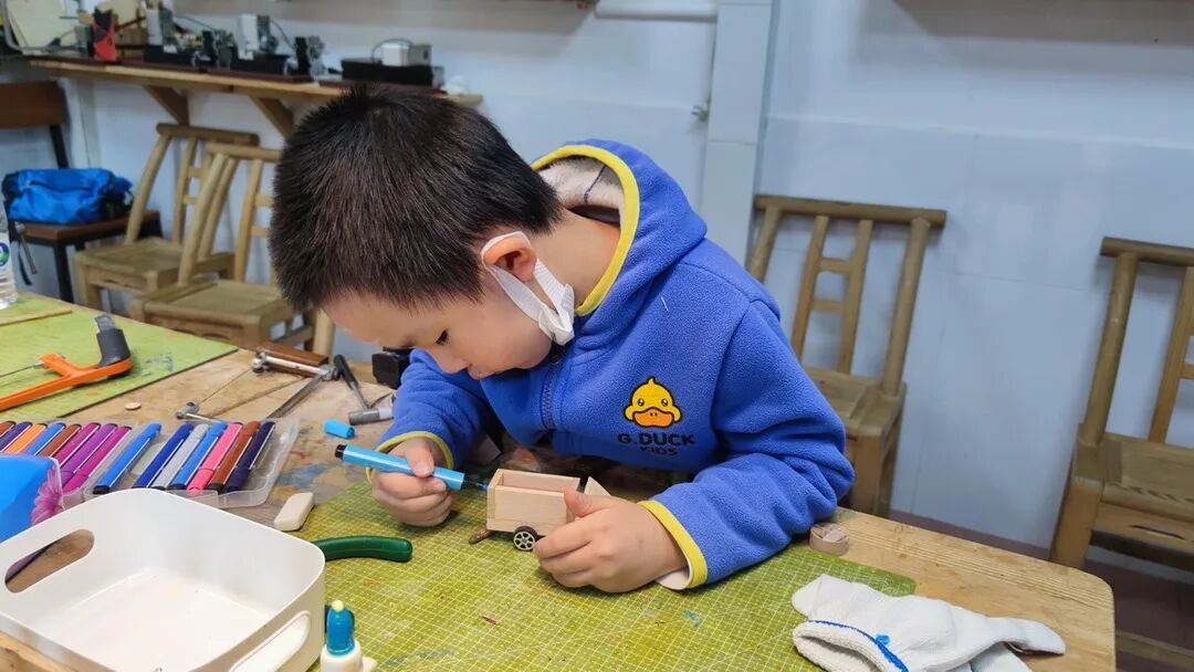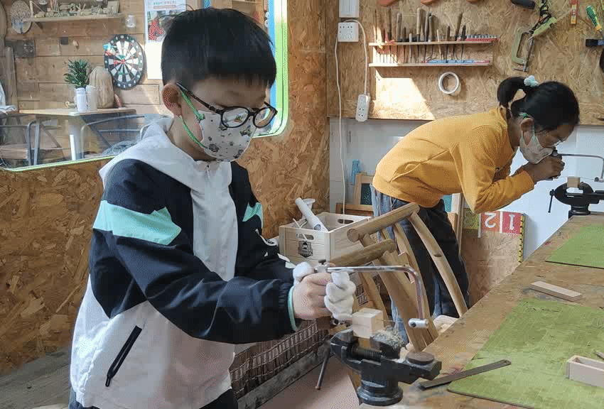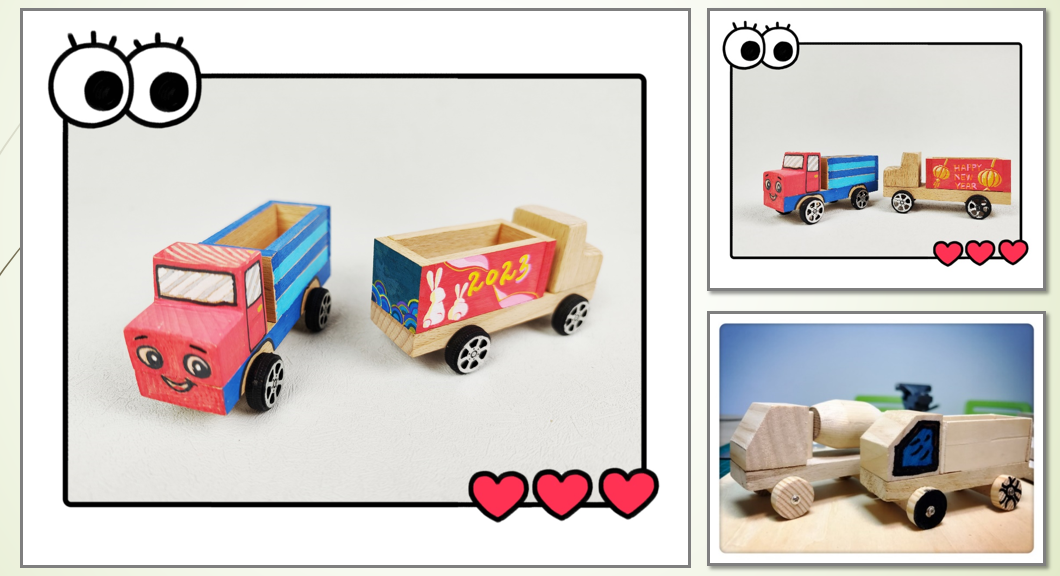 ▲DIY木頭車時,小朋友自己加了車燈和排氣管,是不是很酷!