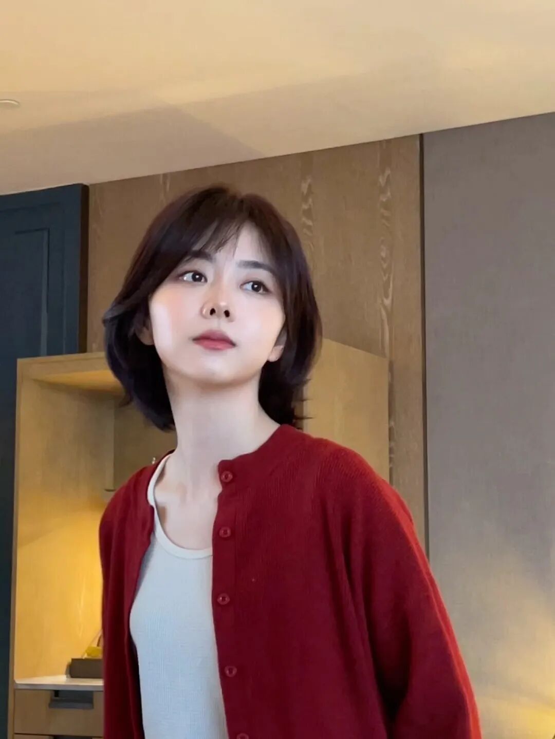酒紅色背心搭配休閒褲隨性自在,隔著屏幕都能感受到她的舒適和鬆弛。