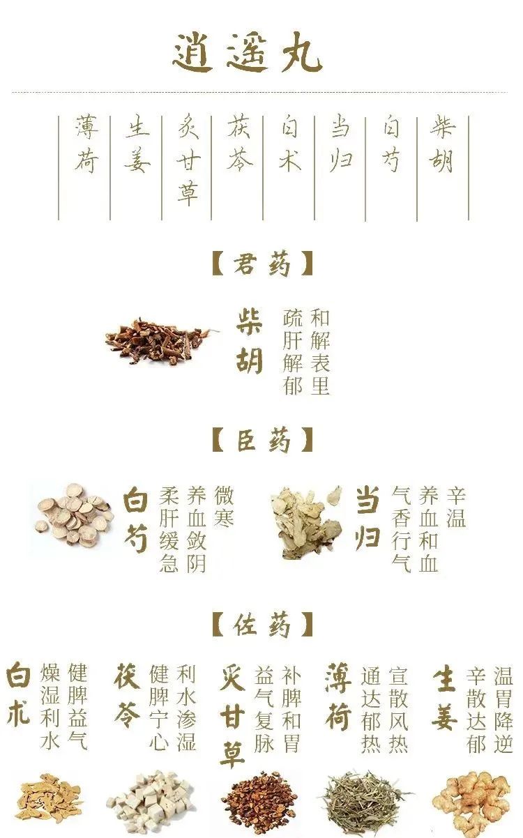 最後,很多人分不清加味逍遙丸應該怎麼用,其實加的這兩味藥是:丹皮和梔子。肝鬱久而上火,如果你有上火症狀,比如口乾口苦,長痘,心煩失眠,這種情況下就可以用加味逍遙丸,丹皮和梔子是清洩肝火的,以此分辨即可。
