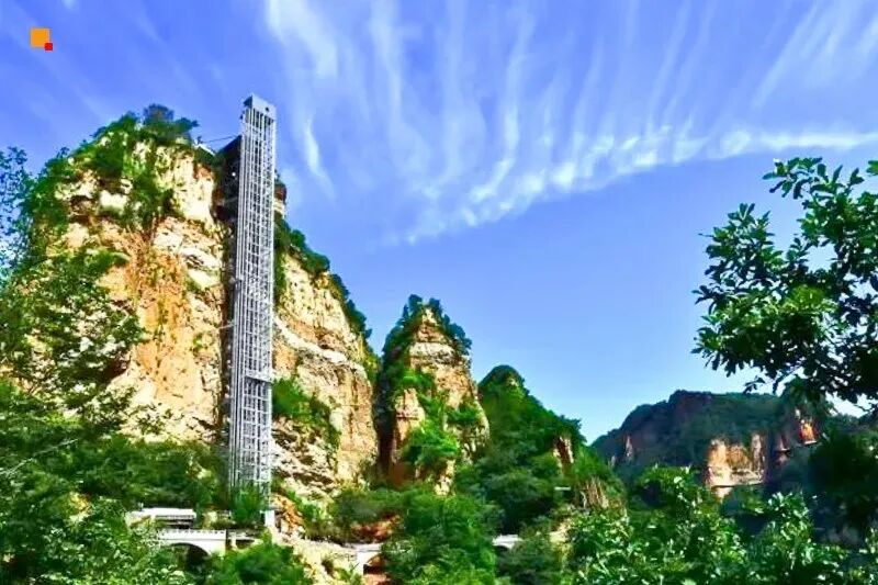 觀光電梯主要設備為國外進口奧的斯品牌,氣勢宏大,採用全暴露式運行。電梯高98米,單向運量400人/時,30層高樓只需1分鐘抵達。依崖而建,是自然景觀與人造奇蹟的完美結合。乘坐觀光電梯到達山頂,興隆山的奇峰異景便可一覽無餘。