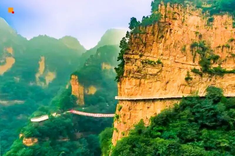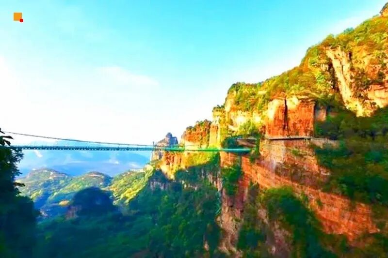 玻璃橋位於兩山峽谷之間,懸掛於650米高海拔之上,總長226米,三個觀景平臺寬6米,整個工程採用進口材料,橋面全部採用透明玻璃鋪設,是一種全玻璃結構的橋樑。