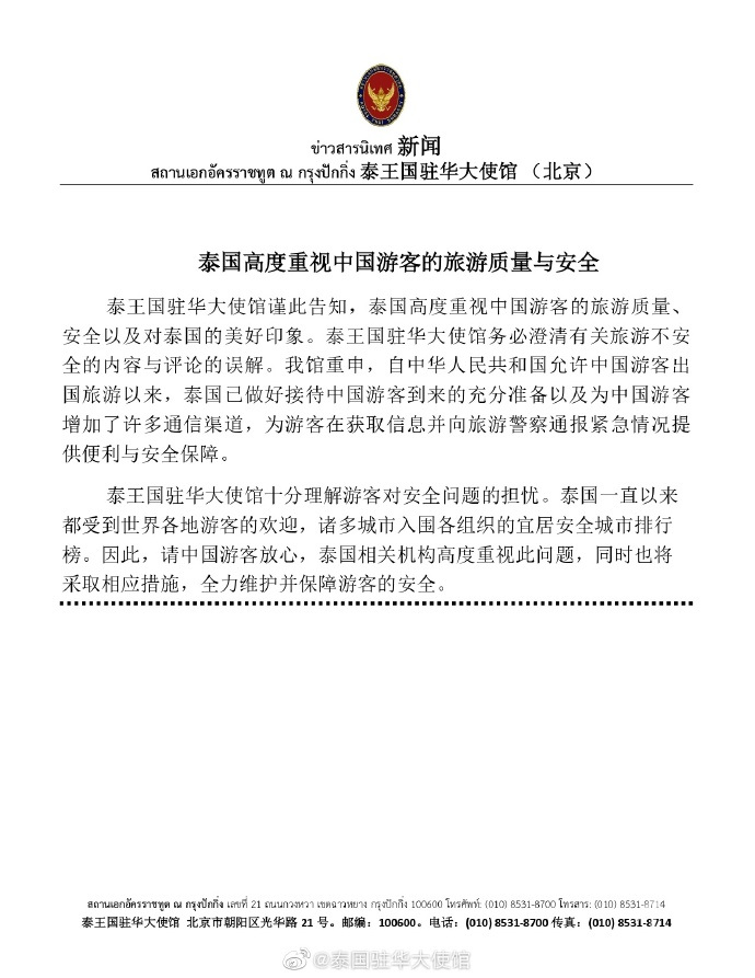 昨日,泰王國駐華大使館在聲明中稱,泰國已做好接待中國遊客到來的充分準備,以及為中國遊客增加了許多通信渠道。泰王國駐華大使館十分理解遊客對安全問題的擔憂。