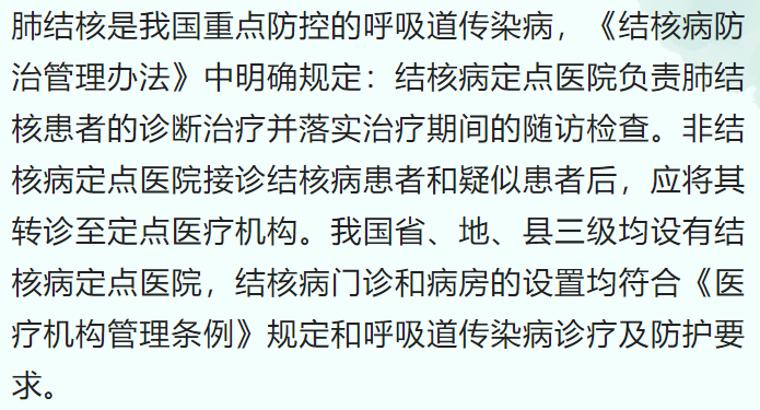 小明在區結核病定點醫院確診了肺結核,可心裡直犯嘀咕,家附近的三甲醫院不是更好麼?醫生為什麼要叫我到結核病的定點醫院就診呢?