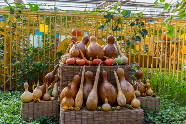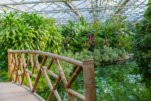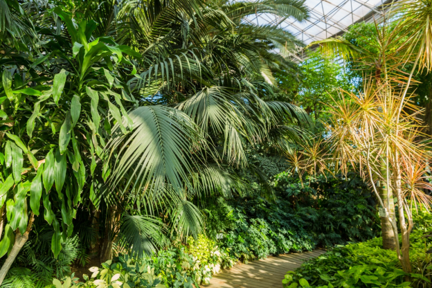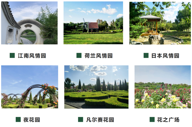 世界花卉大觀園景觀現由六大溫室和十一個花園廣場組成。集中了熱帶、亞熱帶、沙漠和溫帶氣候類型的各類珍稀花卉。溫室內一年四季如春,有1600種植物。戶外區域每年3月下旬就會陸續有各種花灌木開放,到4月上旬進入盛花期,主要有像臘梅、梅花、連翹、迎春、榆葉梅、碧桃等。