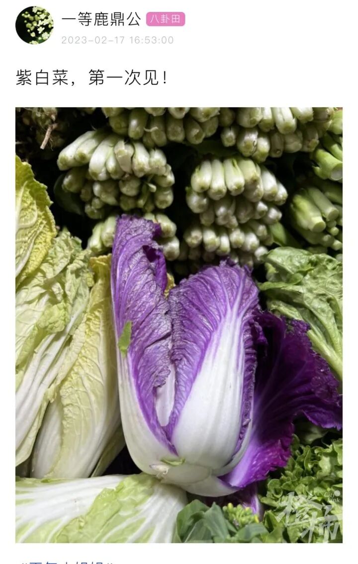 最近,橙友“一等鹿鼎公”還在菜場發現了一種紫色的白菜,說自己還是第一次見。天氣小姐姐查閱資料後發現,這種紫色白菜並不是什麼高科技產物,也不是轉基因食物,就是通過傳統的育種技術而來,更具體點說,是由紫甘藍和膠州大白菜雜交而成,因其富含花青素,所以菜葉呈現出了紫紅色。說白了,紫色白菜就是白菜的一種,主要營養成分與普通白菜差異也不大,只是含有更多的花青素,在我國2009年就開始了栽培,因為價格比普通白菜更貴,沒有在菜場普及而已。