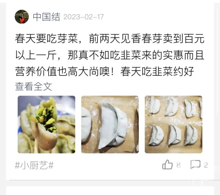 不像清明有清明團,立夏有立夏飯,雨水節氣沒什麼吃的習俗,但是這兩天不少橙友都在安利韭菜。橙友“中國結”說,前兩天見香椿芽賣到百元以上一斤,那真不如吃韭菜來的實惠而且營養價值也“高大上”噢,“春天吃韭菜約好處:增加食慾、益肝健脾、散瘀活血、潤腸通便、美容護膚、殺菌消炎、降血脂、補氣壯陽、明目護肝……自己動手包韭菜雞蛋餡的韭菜盒子,又快又好吃!趕快動手啊,香噴噴噢!”