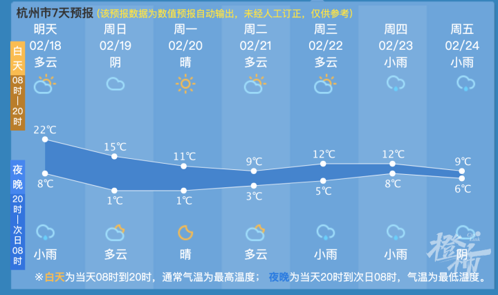 據杭州氣象臺預報,今天白天最高氣溫會比昨天低8到9℃,在15℃左右,早上最低氣溫9℃,平均相對溼度70%。21-22日早晨最低氣溫平原地區0~2℃,有霜凍,山區0~-2℃,有薄冰。冬春之交氣溫波動較大,再囉嗦一遍,一定記得及時添衣,謹防感冒。
