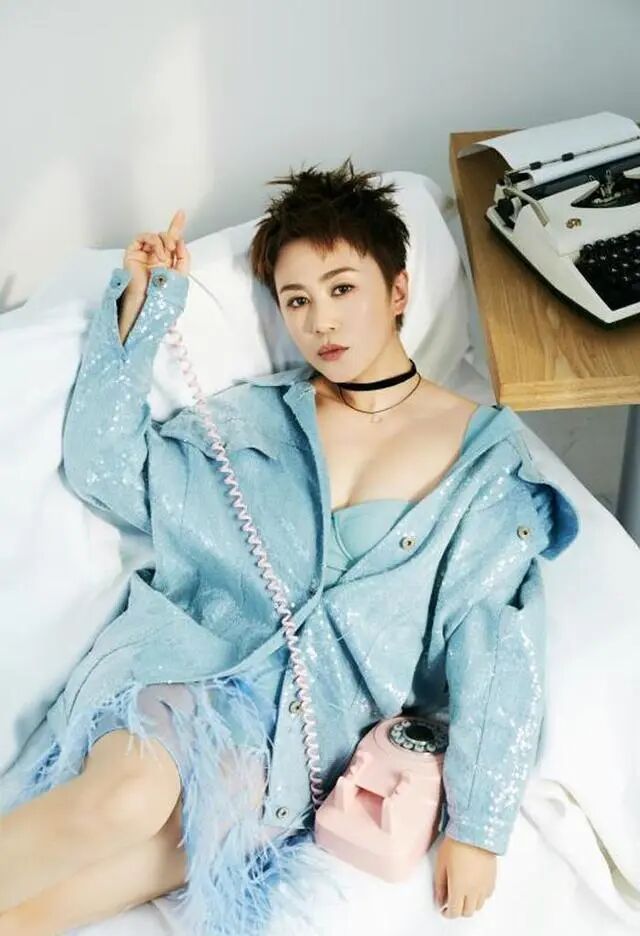 內衣外露將飽滿的胸部完美呈現,誘惑力十足,大秀豐滿身材,外穿一件淡藍色外套,治癒的顏色給人一種特別舒服的感覺,寬鬆的版型時尚感滿滿。