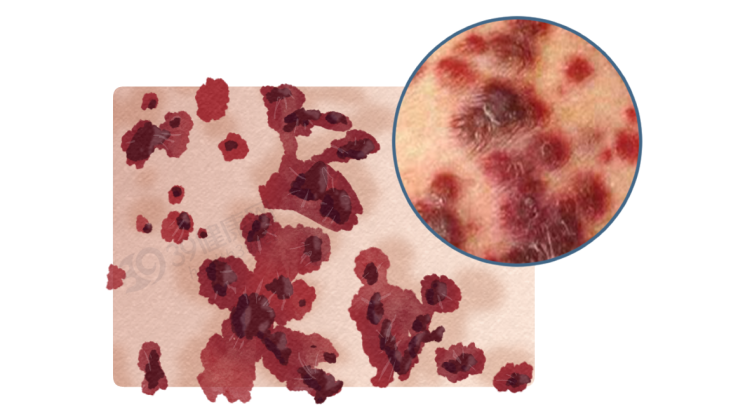 皮疹通常為細小的暗色斑塊,略微有一些隆起。如果皮膚比較白,可能呈現深紅色或紅褐色,皮膚顏色較深者,則可能出現紫色或黑色。