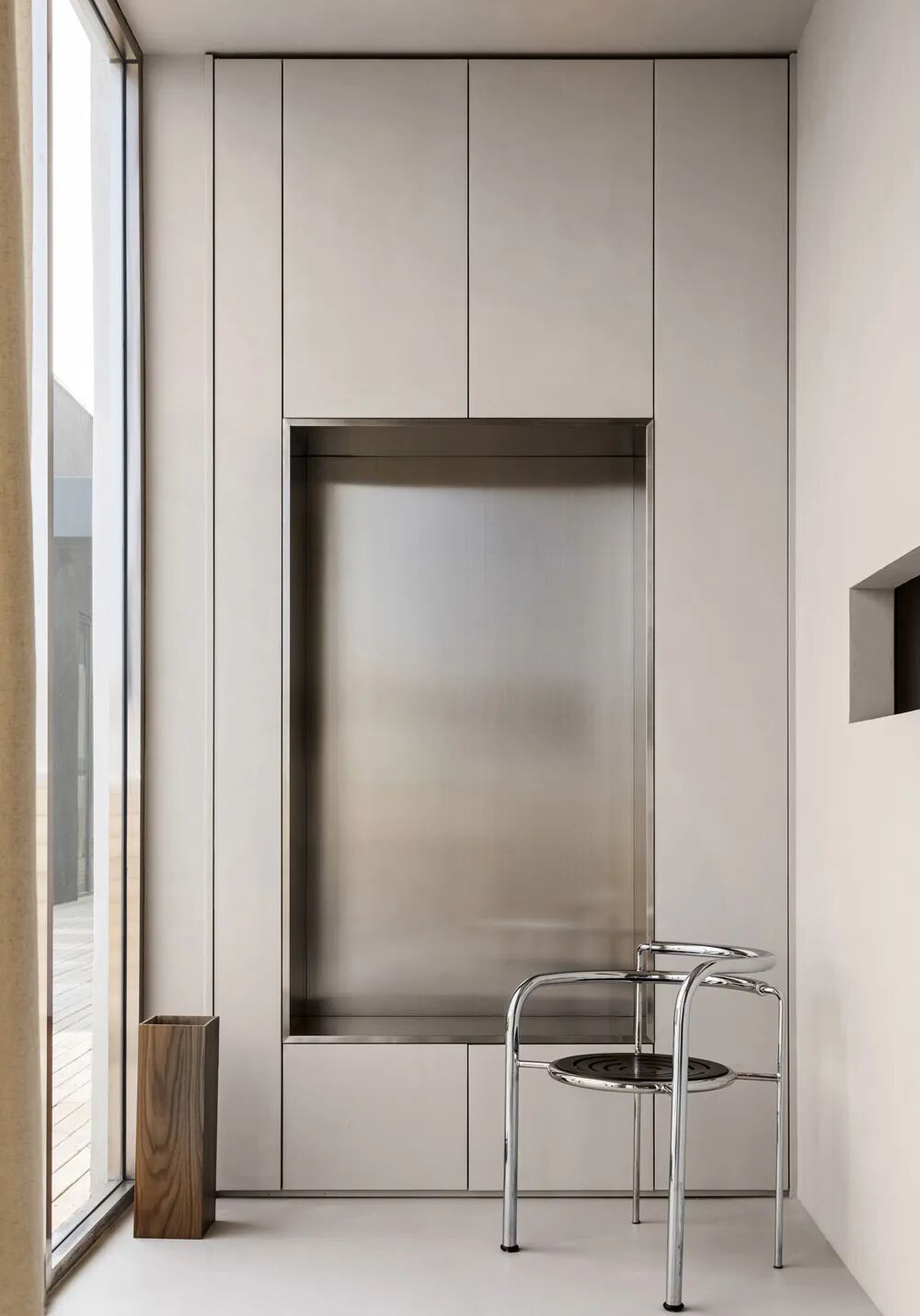 劉暢的工作室Nothing Design坐落於北京西店記憶園區一座純白色的建築中。在這個百平米大小的空間裡,他運用微水泥、西班牙天然粘土、不鏽鋼和經典設計款傢俱“講述”了一個以極簡為主題的空間美學故事,並通過黑白色、原木色和淺橡木直紋的平衡對話完成了對空間情緒的精準表達。