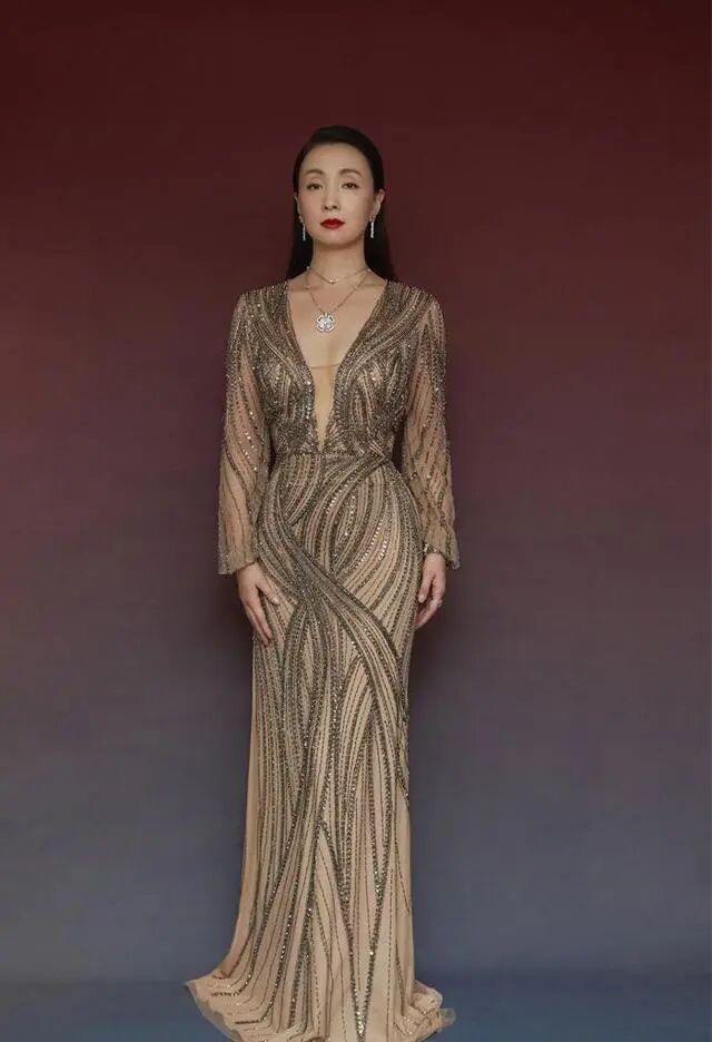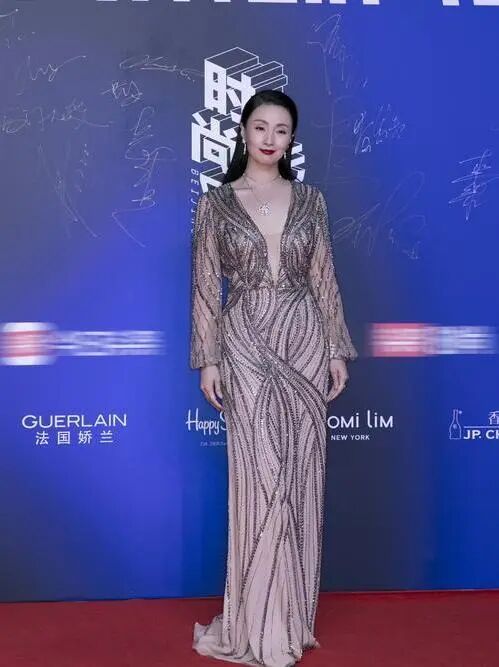 這是一組陶虹在出席活動的照片,照片中陶虹選擇了一件膚色亮片花紋的禮服,禮服採用深V的設計一直開到腰部,展現出陶虹胸前大片白皙的皮膚,露出她精緻性感的鎖骨。