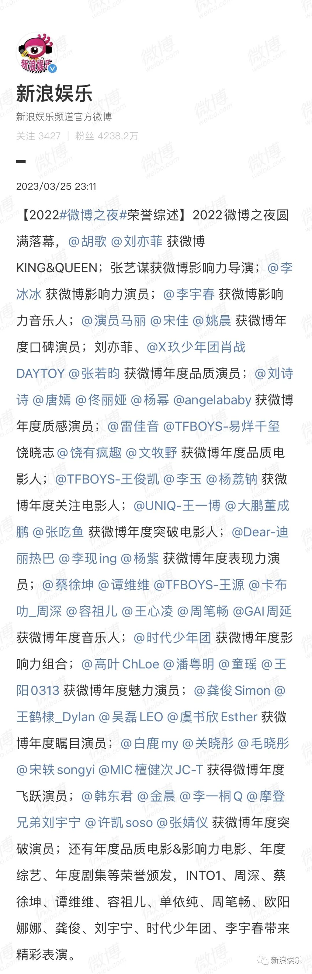 首頁何止是娛樂圈的半壁江山? 何止是娛樂圈的半壁江山?作者: Admin / 2023 年 3 月 26 日 很多人都知道今天是什麼日子, 微博之夜,內娛過年。 胡歌官宣當爸後首次公開亮相、 八五花們齊聚一堂、 TFBOYS久違地三人同場活動、 還有去年冬奧賽場上的“紫薇星”谷愛凌…… 真·娛樂圈團建! 從官宣陣容到明星造型,從夢幻同框到驚喜花絮,你最想看到的和讓你意想不到的,都在微博之夜! 話不多說,馬上為大家送上今夜最全回顧和總結。 01 這類大型活動最大的看點、也是粉絲期待已久的,莫過於各家藝人的造型圖。 好消息👉工作室捲起來了~ 壞消息👉眼睛要看不過來了! 先來看女明星組, 李冰冰走的是暗黑風,黑絲絨禮服搭配精緻的藍寶石耳飾, 手上的黑玫瑰和全身造型相呼應, 經典紅黑配色,盡顯大花身上獨特的颯與美。 劉亦菲的青色花朵羽毛長裙, 宛如驕傲的孔雀公主。 楊冪的紅玫瑰造型,美豔不可方物, 加上披風又變身御姐, 我說一個數,三天之內我就要看到塗山紅紅! 不過據大冪冪的微博提問,紅裙下面藏著的…….有可能是暖寶寶或秋褲。 如果說“神仙姐姐”劉亦菲今天是藍孔雀,那Angelababy的造型就是黑天鵝。 孤傲冷豔,黑翎包裹下的靜謐之美, 女媧炫技之作我說累了。 劉詩詩,一襲典雅溫柔的藍色流光長裙搭配“醒獅”項鍊,把波光粼粼穿在了身上, 穩定輸出的肩頸線條和美背,有如空谷幽蘭,又像一首清冷的宋詞, 氣質拿捏住了。 “仙劍三美”齊聚,唐嫣今天選擇了粉色公主裙, 人如其名甜度爆表, 誰會不愛元氣甜妹呢!!! 值得一提的是,這次八五花全員上身高定,內娛女明星的排面,🈶️ “姐姐”們這次則黑色居多,主打的就是一個經典。 姚晨的黑紗魚尾裙,大氣灑脫,身姿曼妙。 宋佳的黑色漆皮套裝加亮面紅色高跟鞋,機能感十足, 必須誇誇姐這張工作室出圖↓ 是可以直接放進時尚雜誌的程度! 高圓圓的披風長裙,氣場全開。 “大嫂”高葉也來了,黑金色修身刺繡長裙搭配黑色禮帽, 復古紅唇,明豔奪目,姐就是女王! 同樣在造型中加入了“禮帽”元素的還有迪麗熱巴, 經典黑色西裝搭配紗裙,輕柔與挺括交織融合,恍若舊畫報上的復古名伶。 張雨綺,繽紛的抹胸湖藍長裙,層層疊疊的的裙襬就像蛋糕上的裱花, 謝邀,人已在法國排隊中。 佟麗婭的紫色碎鑽吊帶禮服,溫婉貴氣。 同色系的還有楊紫的紫色深V紗裙,優雅動人, 是仙氣飄飄的“菡萏仙子”沒錯了~ 女明星百花齊放,男明星組也各有巧思。 胡歌,星星點點的黑色西裝,深邃成熟。 肖戰,香檳色刺繡西裝,讓人聯想起了《小王子》。 王一博,黑大衣搭配墨綠絲絨手套,胸前的鑽石胸針很吸睛。 易烊千璽再穿黑西裝,一組黑白肖像圖彰顯質感。 王源內搭白色馬甲,手臂線條矚目。 王俊凱選擇了灰色拼接風衣,清貴俊逸。 蔡徐坤黑絲絨全黑look,小說裡的精英男主有臉了。 還有李現、龔俊、王鶴棣、吳磊、許凱、時代少年團…… 篇幅有限,無法一一介紹,而這些只是今天微博之夜陣容的冰山一角。 02 如果說瘋狂內卷的工作室美圖是粉絲福利,那微博之夜的內場則堪稱CP粉的天堂。 初代“逍靈CP”:胡歌&劉亦菲 這兩位也是今天的微博King&微博Queen, 胡歌的獲獎感言還特意cue到了趙靈兒和李逍遙的“十年之約”, 仙一組已贏麻。✌️ 仙三“陽葵”CP:胡歌&劉詩詩 這個座位安排,只能說i仙劍有福了。 “雙楊”座位緊鄰,不知道兩位大美女在熱聊什麼。 一字排開:劉亦菲、胡歌、劉詩詩、楊冪、Angelababy,人均神仙側顏。 世紀大同框,誰的青春回來了!😭 去年夏天爆火的《蒼蘭訣》,“尊上”王鶴棣和“小蘭花”虞書欣再度同框, 以及剛剛合作了《以愛為營》的王鶴棣、白鹿, 《換乘戀愛》,但是微博之夜版。 喊話張凌赫怎麼不過來坐的建議多說點,我愛聽。 還有各種意想不到的夢幻聯動, 易烊千璽&迪麗熱巴、 為大家送上美女wink,路過被可愛到了誰懂。 宋佳&谷愛凌、 宋佳演我看到谷愛凌: 楊紫&張若昀, 兩位用極具感染力的臺詞講述了一個又一個英雄故事,淚目。 肖戰&劉亦菲, “顏霸”同框,誰給這兩位遞個本子,對我的眼睛很友好。 不光好看,更好玩。 擔心尬場? 無所謂,社交恐怖分子會出手—— 激動得像是買票進場的鄧超。 INTO1表演結束,擔任過《創造營》導師的鄧超來了個飛吻; INTO1領取榮譽,他在臺下也比耶, 喜報:他超愛! 同樣自信大方的還有今天獲得“微博年度影響力體育人物”的谷愛凌。 不說話是美麗優雅的公主, 臺上擺pose是活潑可愛的小女孩, 不愧是我的朋友! 微博之夜對於鄧超來說是春晚,對於INTO1則是軍訓現場。 十一位成員臺下坐得筆直, 放在整個現場都是相當炸裂的存在。 對於“人間百靈鳥”來說,微博之夜則等同於文藝匯演現場, 龔俊和劉宇寧同臺演出《霓虹甜心》, 質疑阿拉俊子報班的可以停一停了,俊子已經在你看不見的地方到達next level。 時代少年團全員搭配保溫杯、鑰匙串、金絲邊眼鏡復古(整蠱)三件套, 寫稿暫停,我去接! 楊紫、李現、迪麗熱巴同臺領獎, 確認過了,這領獎臺多少有點燙腳。 八五花再次挑戰搞怪單品,舞臺變秀場, 這不就夢迴了。 美女們下場,“詩冪”穩定上分中。 微博之夜唯一指定“站哥”:張大大, 坐等一波張大大的出圖! 雖然大家都調侃今天的微博之夜來了娛樂圈的半壁江山,但圍觀完整場最想感慨: 何止是娛樂圈的半壁江山? 正如今晚年度總結VCR中