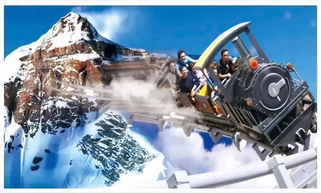 急速的飛車沿軌道蜿蜒穿梭在陡峭的山峰