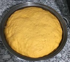 做法:南瓜蒸熟,晾至溫熱。小棗剪成棗碎。800克麵粉,將棗碎倒入麵粉一起。南瓜攪成泥,溫熱狀態,加入白糖和酵母粉,攪拌均勻。溫熱狀態加入酵母粉,可以讓酵母活性發揮至最大。高溫會把酵母活性毀滅……將南瓜泥倒入面盆中。