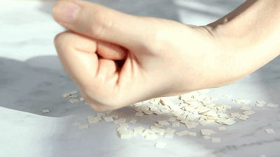 在手背塗抹祛斑霜後嘗試碰觸碎紙屑,幾乎不會沾上,清爽程度棒。