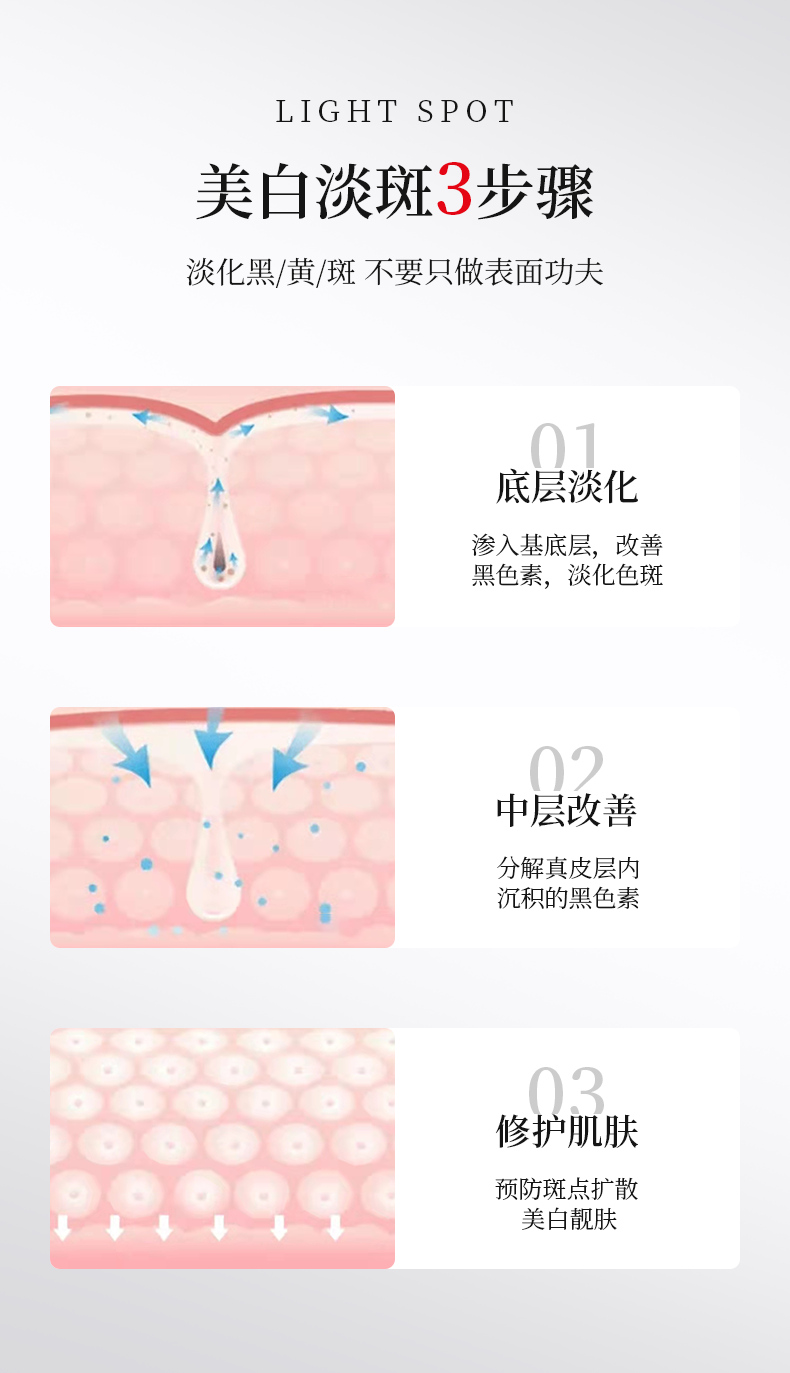 祛斑霜通過抑制黑色素生成,促進黑色素的代謝,減少黑色素在皮膚中的堆積,源頭淡斑祛黃。