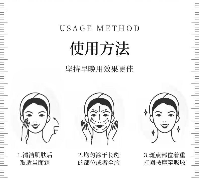 用起來也非常方便,只要將祛斑霜塗抹在斑點處,按摩至吸收即可。
