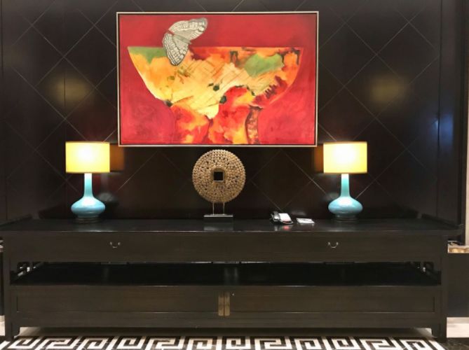 走進電梯,會發現酒店設計不會錯過任何客人會經過的地方。一幅現代紅色掛畫,一個古代竹子的錢幣,兩盞暖色調的小檯燈,端莊大氣又不失溫婉,給人賓至如歸感覺。