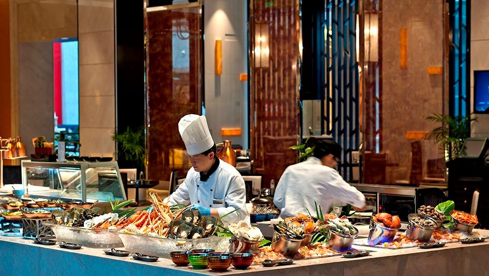 走進大堂,紅色水晶吊燈搭配中式地毯,氣派輝煌。站在大堂吧中,中西合璧的設計風格又出現了,一個透過30米挑高的寬闊天井玻璃窗的咖啡吧,搭配兩扇紅色巨門,在浪漫的星光下聽著音樂、品味咖啡或雞尾酒,或者仰望星空或者看著樂隊表演盡情放鬆心情,愜意享受閒適。