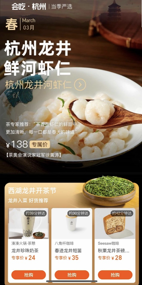 為更好滿足消費者對龍井系新品的需求,讓更多人足不出戶就能品嚐龍井美食新品、感受西湖龍井開茶節的氛圍——今年開茶季期間,餓了麼在“會吃“頻道也同步上線了當季嚴選的龍井美食活動,用戶搜索“西湖龍井開茶節”即可嚐鮮相關趨勢新品。