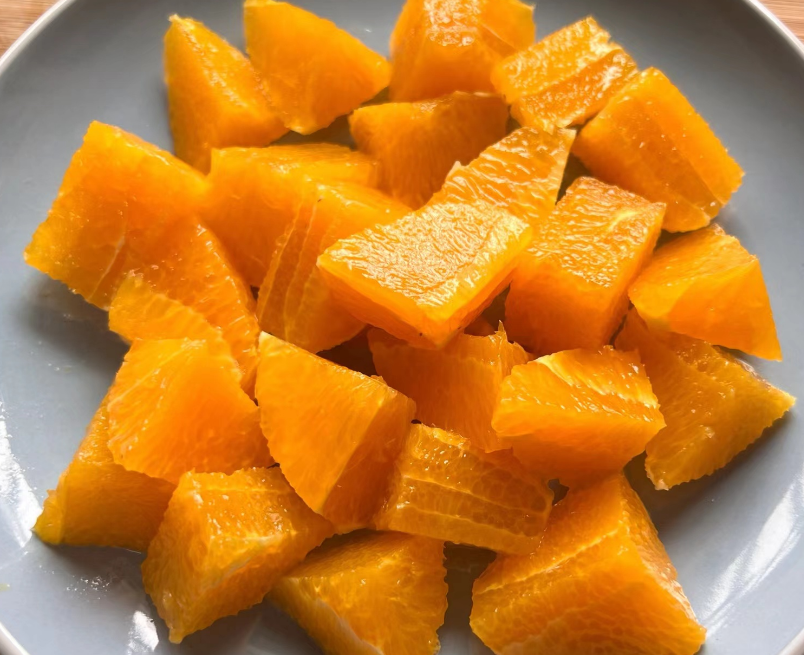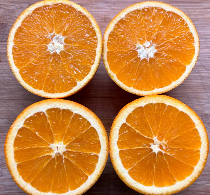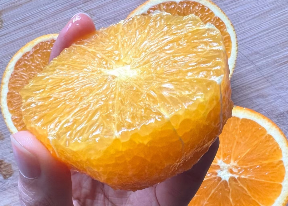 倫晚橙捏著表皮偏硬些,對半切開,汁水就順著刀滴下來,橙香濃郁,真真是純甜汁兒多。