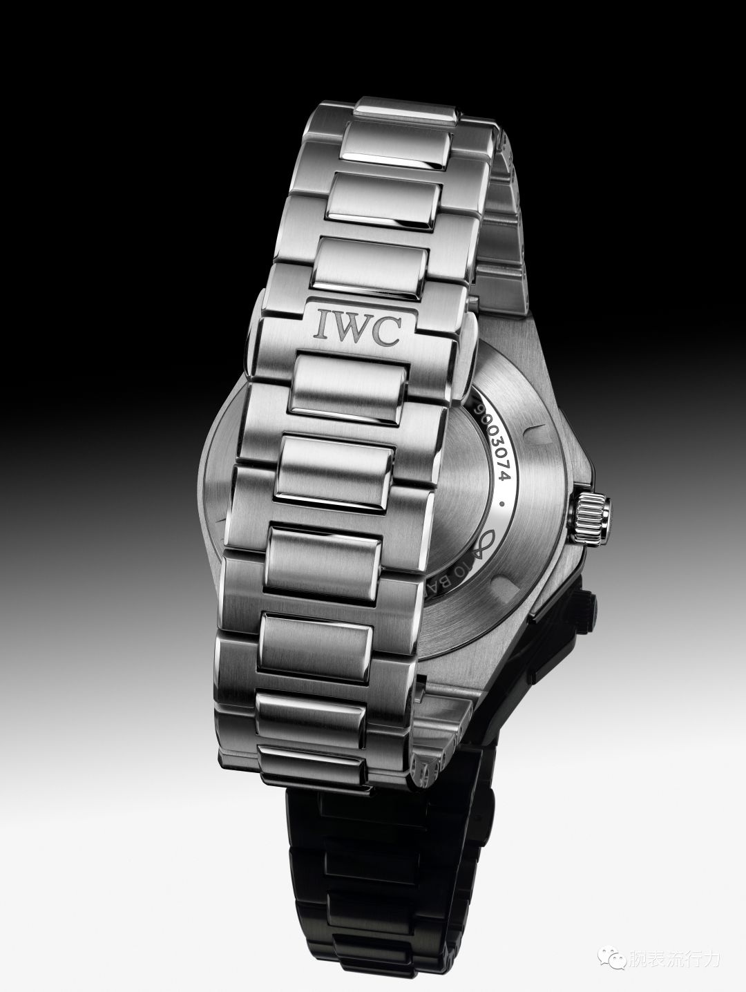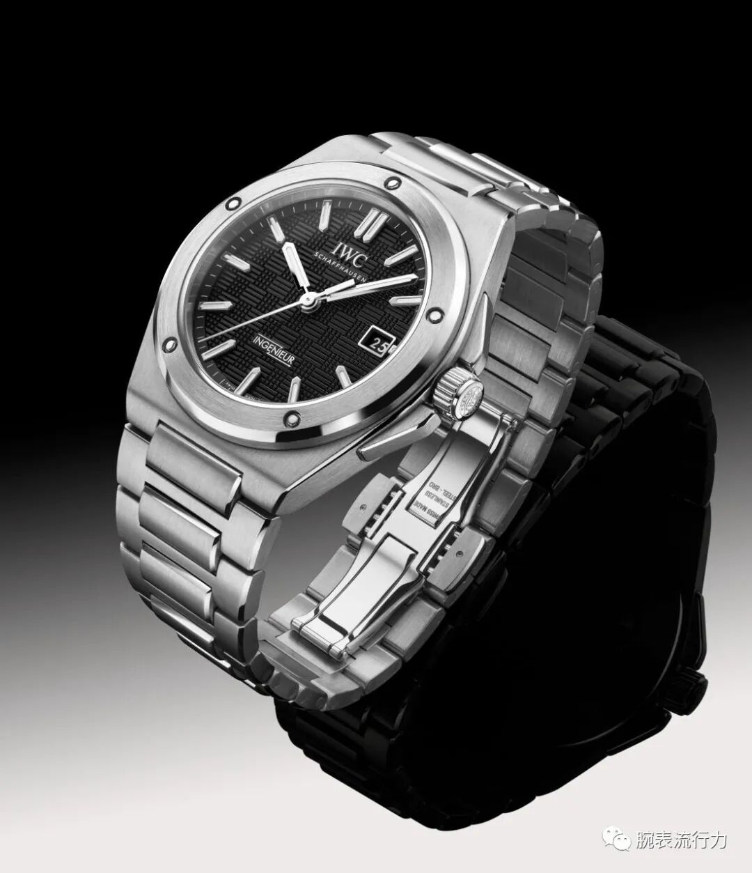 工程師自動腕錶40,型號IW328901:精鋼錶殼,黑色錶盤,鍍銠指針和時標,帶蝴蝶式摺疊表扣的一體式精鋼錶鏈