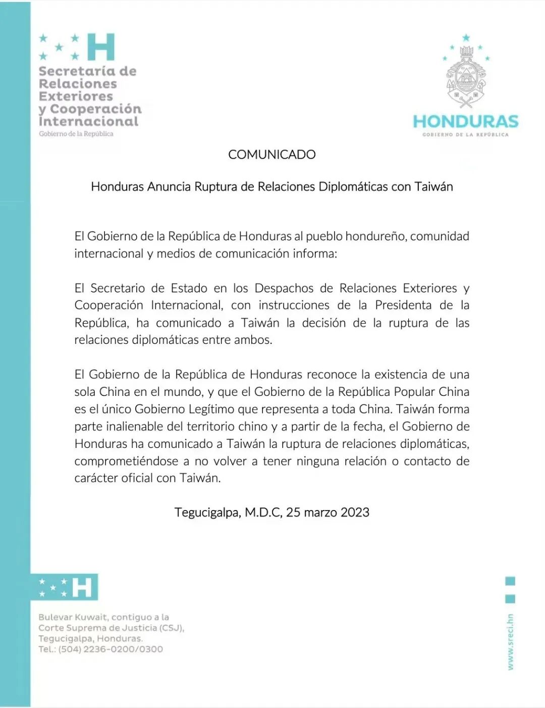 當地時間3月25日,洪都拉斯外交部發表聲明,正式宣佈與中國臺灣斷絕“外交關係”。
