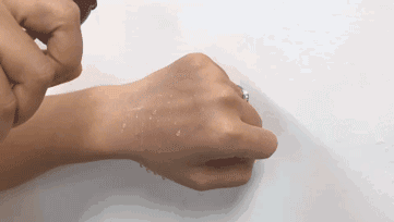 可以看到手上的水珠狀是呈一顆一顆停留的,“遇水成膜”,說明防水。