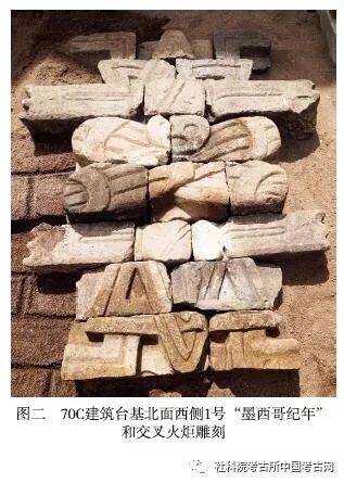 科潘遺址8N-11號貴族居址的發掘是中國考古學者在中美洲地區主持的第一個田野考古項目。該居址主體是一處封閉的方形院落,內部邊長約35米,四面均為石砌高臺建築,外緣邊長約50米,南側中部有通道。庭院周圍分佈著20多處小型建築。在北側主建築(編號為70C)的第二層臺基上,發現了13組馬賽克式拼接雕刻,東、西兩壁各均勻分佈3組,北壁均勻分佈5組,南面臺階兩側臺基居中位置各1組。雕刻內容均為“墨西哥紀年”(Mexico Year Sign)符號和交叉火炬圖案組合,由從下數第三層切割石的位置開始拼砌,共8層,每層有2或3塊雕刻部件,共由19或20塊部件組成,最寬處約1.1、高約1.5米。