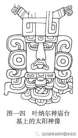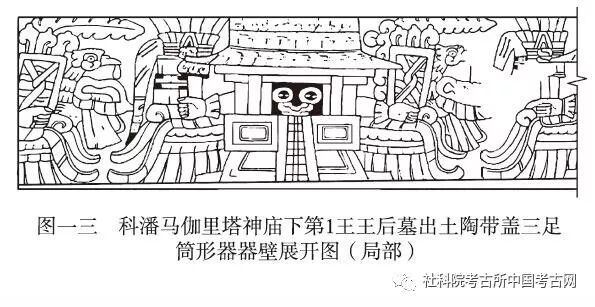 科潘的大量考古發現證明Q號祭壇的記載是可靠的信史,科潘王國的建立確實與特奧提華坎存在密切聯繫。在科潘馬伽裡塔(Margarita)神廟下第1王的王后墓中,隨葬了1件陶帶蓋三足筒形器,上面有第1王神廟的彩繪。神廟臺基為典型的特奧提華坎“方框—斜坡”式(talud-tablero),兩側有展開的鳥翼。第1王的面孔浮現在漆黑的神殿內,佩戴雙環眼飾;雙手伸出,左手持盾,右手握“墨西哥紀年”式寬帶結捆紮的集束式火炬(圖一三)。同出的兩件黃鐵礦鏡子的背面有白灰底彩繪圖案,具有典型的特奧提華坎風格,包括“墨西哥紀年”和繩結圖案。科潘第2王為紀念第1王建造的葉納爾(Yehnal)神廟的臺基壁面上,有呈太陽神面相的第一王的白灰彩繪雕像,王冠即為“墨西哥紀年”和交叉火炬形狀(圖一四)。