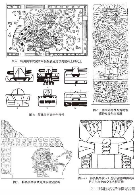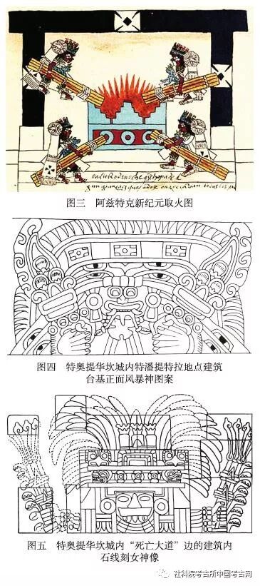 尤為重要的是,特奧提華坎最高大的建築太陽金字塔前的神殿阿多薩達(Adosada)內出土了3件石雕,費什(William Fash)等人認為表現的正是交叉火炬熊熊燃燒的情景(圖一〇)。同時發現的一些方形石柱上也有相同的雕刻圖案。在該神廟中發現一個石砌方臺,上面放置了一件石香爐。這些跡象表明,這座神殿的主要功能很可能就是舉行與阿茲特克迎接新紀元類似的,以燃燒火炬為重要內容的儀式和祭祀活動。據最近的研究,燃燒火炬儀式在阿茲特克時期並不僅僅在迎接新紀元時舉行,在新城市建立、新的重要宮室或廟宇奠基、就職典禮等重要場合也會舉行,與建立新的政權密切相關。特奧提華坎時期,在阿多薩達內舉行的燃燒火炬儀式也應有多重功能。