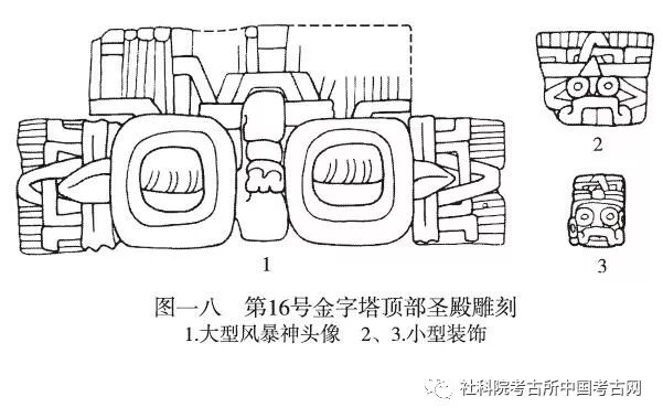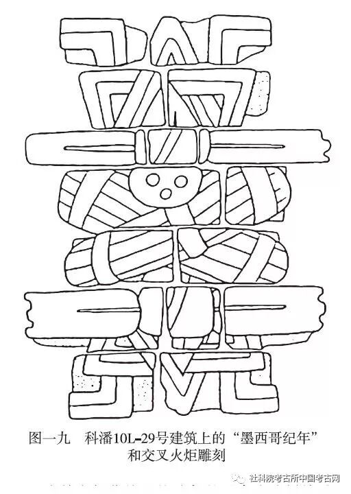 第16王雅始帕薩時期,對特奧提華坎傳統的宣示達到頂峰。他主持完成的第16號金字塔是整個王室區最崇高的“聖山”。在其頂部坐南朝北的聖殿內的神龕中,第1王面帶標誌性的特奧提華坎式雙環眼飾,手持盾牌,一派特奧提華坎武士風範。聖殿外牆上有特奧提華坎風格濃郁的馬賽克式拼接雕刻,包括環眼兩側有“墨西哥紀年”和繩釦紋裝飾的大型風暴神頭像和小型裝飾(圖一八)。第16王的寢宮為16號金字塔南側的10L-2號庭院。其西北角為一座編號為10L-29的“L”形特殊建築,外牆上有與8N-11號居址70C臺基上完全相同的“墨西哥紀年”和交叉火炬圖案(圖一九)。在庭院西南角的建築10L-33上面,則有小型交叉火炬和風暴神鵰刻裝飾。