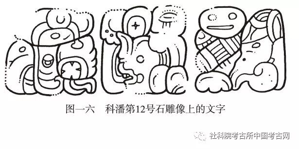 科潘第12王卡克烏提(K’ahkUti’Witz’K’awiil)是整個瑪雅世界在位時間最長,也是最長壽的國王之一,統治科潘68年(公元628~695年在位),享年91歲。他帶領科潘走向強盛,遠交近攻,牢固控制了現在危地馬拉境內的基裡瓜(Quirigua)屬國和瑪雅世界最重要的玉料資源。第12王石雕像(科潘6號雕像,stela6)的王冠上有典型的“墨西哥紀年”符號和繩結以及特奧提華坎式風暴神頭像(圖一五)。他的另一座石雕像上的銘文中,則尊稱第1王為“交叉火炬聖殿之主”(圖一六)。他的墓葬深埋在第26號金字塔(即“文字臺階金字塔”)之下,是科潘考古史上最重要的發現之一,出土了以第1至第12王塑像為器蓋的陶製焚香器,其中第1王的塑像也是面帶雙環眼飾。