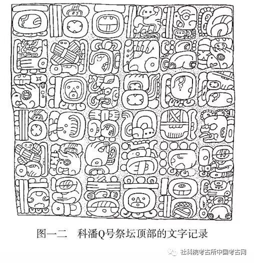 科潘最後一任國王第16王雅始帕薩(Yax Pasaj Chan Yopaat,公元763~810年在位)時期的Q號祭壇的四個側面上雕刻著科潘16任國王薪火相傳的場面。第1王雅始庫克莫(K’inichi Yax K’uk’Mo’,公元426~437年在位)面帶特奧提華坎標誌性的風暴神雙環眼飾,右手持特奧提華坎式方盾,左手持象徵權力的火炬,正要遞交到第16王手中。頂部的文字記錄了第1王建立王國的光榮歷史(圖一二)。根據上面的記載,第1王在一個以交叉火炬為標誌的聖殿內(左數第二豎行第2個字符和第一豎行第5個字符)獲得了神力和建立王國的身份。著名瑪雅文字學家斯圖阿特(David Stuart)將這個字符釋讀為Wite’Naah,意為“根源之屋”(origin house),認為第1王在此聖殿內獲得了“齊尼奇”(K’inichi,意為光芒四射的、太陽神的)和“雅始”(Yax,新生的、綠色的)這兩個國王才能享有的高貴稱號,並獲得了卡威爾(K’awil,閃電神)法杖。費什認為,這個“根源之屋”就是特奧提華坎太陽金字塔前的阿多薩達神殿,第1王正是在那裡獲得了可以建立王國的身份,經過150多天的長途跋涉,來到科潘,建立王國。特奧提華坎在當時因其強大的武力和崇高的宗教地位,成為整個中美洲地區的聖地,科潘第1王的朝聖之旅對他建立王國的事業至關重要。因此,交叉火炬圖案在科潘是與王國起源和聖地特奧提華坎具有特殊聯繫的重要符號。
