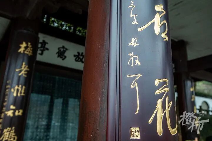 在孤山放鶴亭中,最靠外的亭柱上有一副楹聯“世無遺草真能隱,山有名花轉不孤”,為“虎門硝煙”的民族英雄林則徐所撰。上聯讚頌林逋終身隱居、不慕榮華的高風,下聯從孤山的名字生髮聯想,言有梅花相伴,則孤山不孤。
