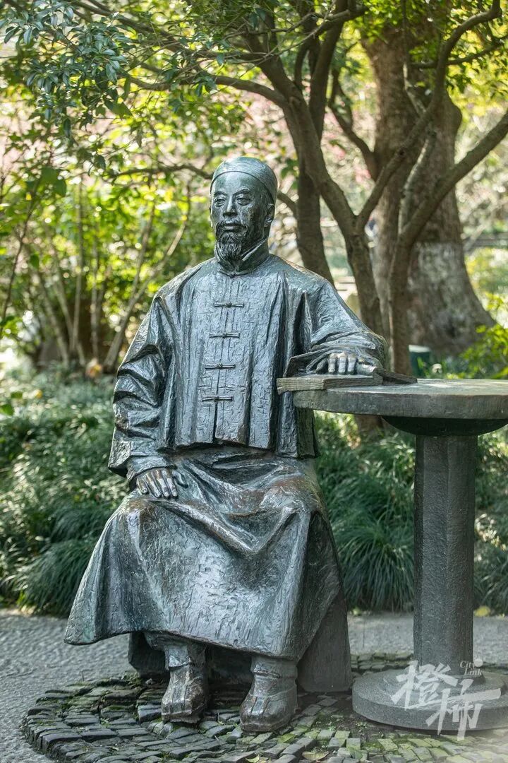 同一年,西湖景區在林社東側綠地上,建了一座林啟坐像,身穿長袍,倚在一張小圓桌旁,望著他最愛的孤山視角下的湖光山色。