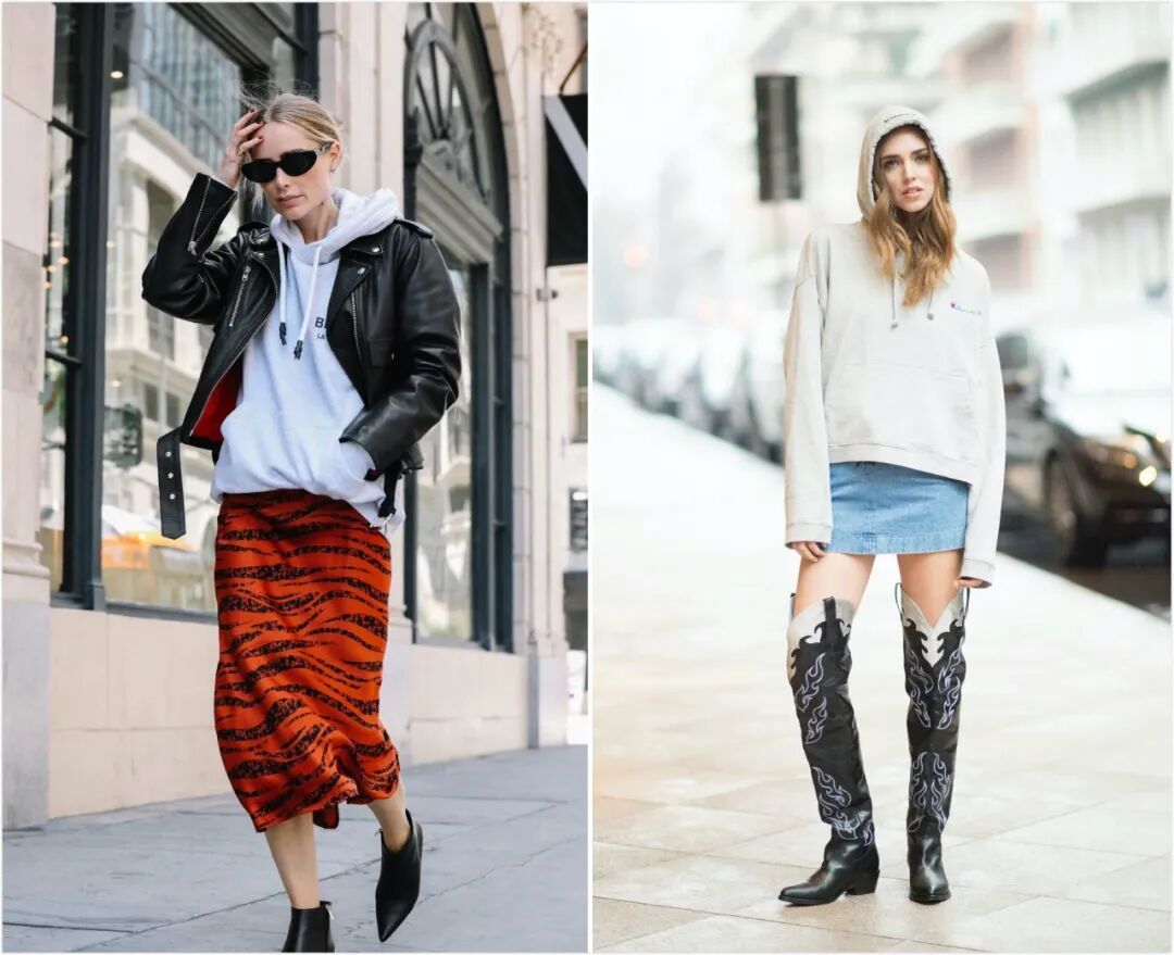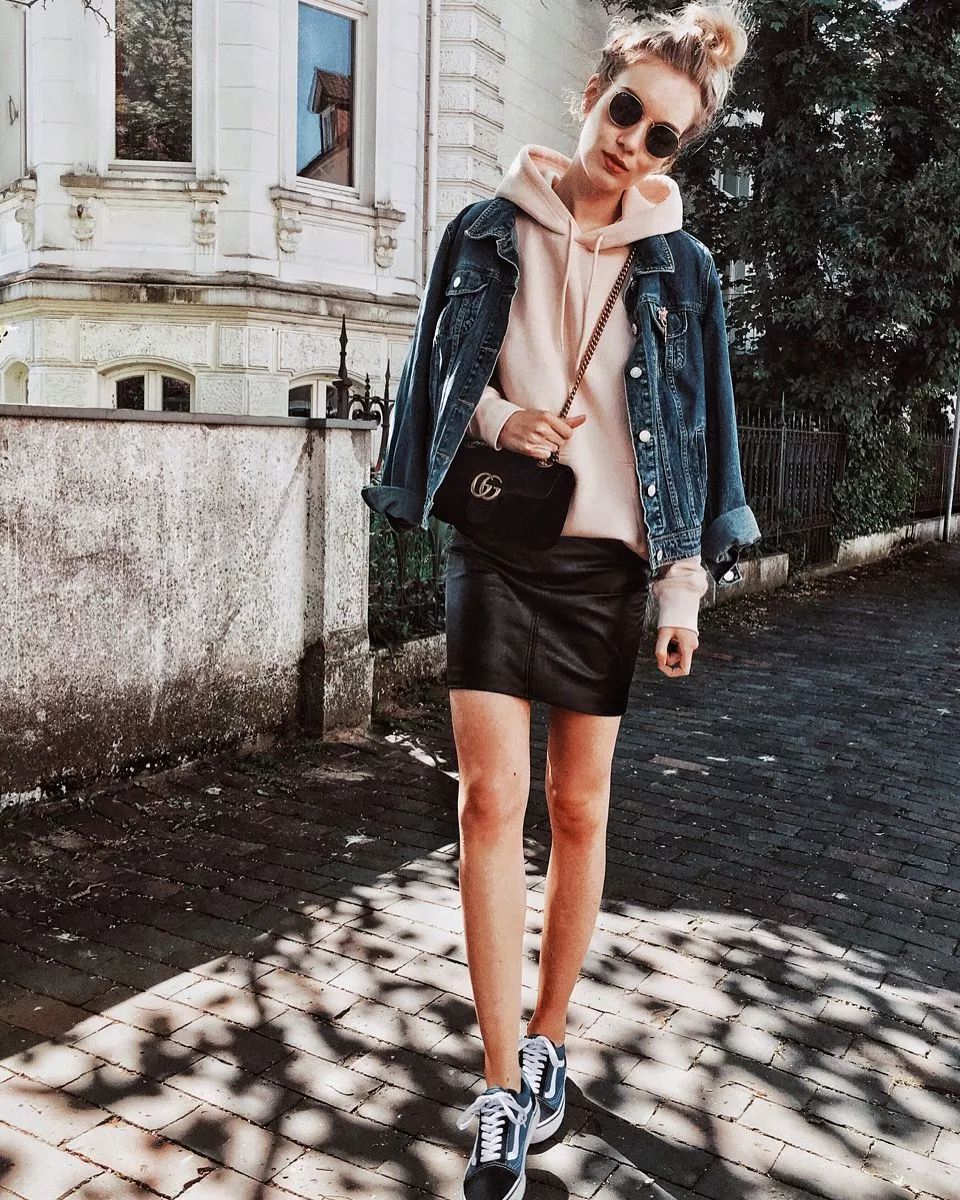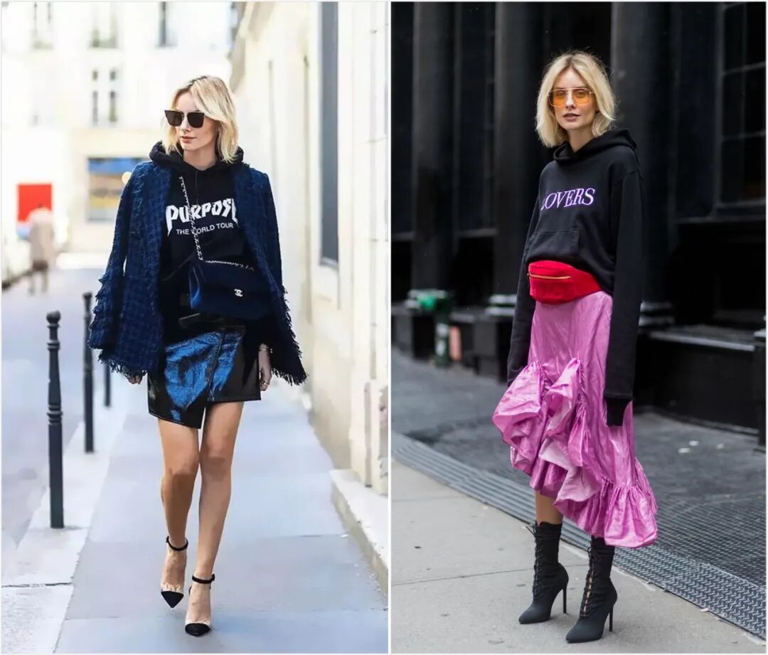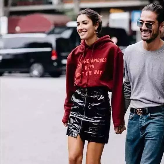 要說和衛衣最搭的裙子,絕對非皮裙莫屬。兩個又酷又個性的單品,結合起來超級養眼!