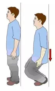 直立,背貼牆,雙足分開同肩寬,雙手置於身體兩側。頭中立位,兩目前視;背部沿牆慢慢向下滑動直至你膝彎曲呈90°,就好像坐在凳子上一樣。如果你暫時不能降至這個水平,可以先練習滑動至一半的高度;保持5秒鐘;緩慢甚至雙腿,恢復初始姿勢;重複5次.