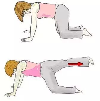 四肢著地,頸部與地面平行;緩慢將一隻腿平行於地面後伸。腳可以伸直或者彎著,只要你覺得舒服。注意在你後伸腿的時候,不要讓你的腰部、頭或者腹部下垂。做這個動作的時候,要確保你身後沒有人以防踢傷。保持5秒鐘;還原動作,並重復5次;換另外一隻腿,重複如上練習動作。